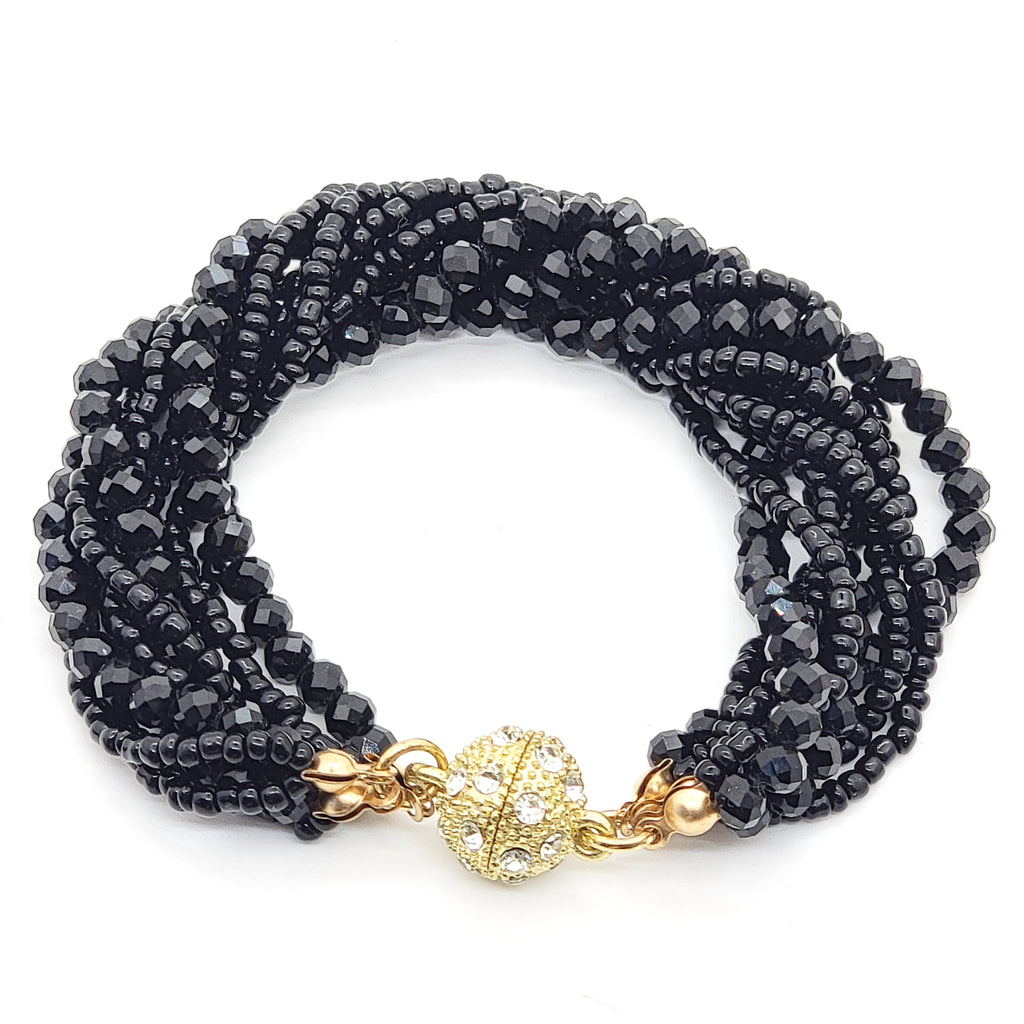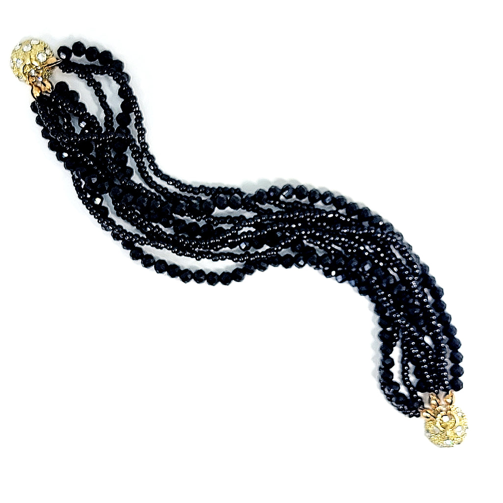 Nine strands of faceted crystal beads, some tiny, some larger, reflect the light in a cascade of sparkles. They're all connected by a round magnet clasp studded with crystals that allows you to put it on and remove it with ease.