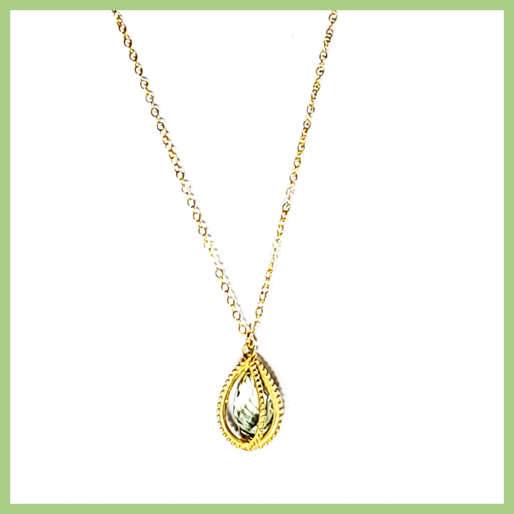 This elegant pendant is reminiscent of a Faberge egg. It has a large, faceted green amethyst gemstone sitting inside a 14k gold filled cage. The cage is teardrop shaped and beautifully detailed, and allows the stone room to move, so the facets catch the light.
